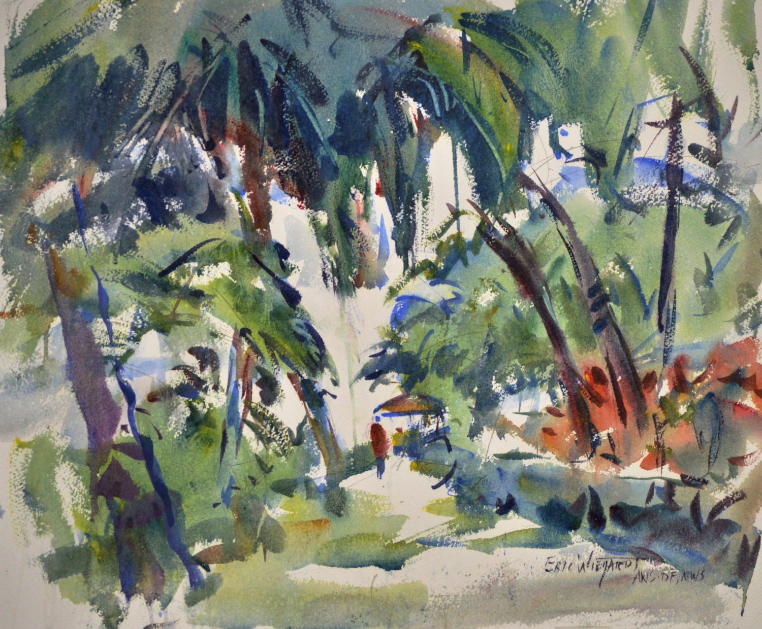I had a wonderful trip to Belize with my watercolor students, where we did several outdoor paintings. It was great to be there during the winter, enjoying some warm sunshine. The palm trees were especially delightful to paint, creating a beautiful tropical atmosphere.
